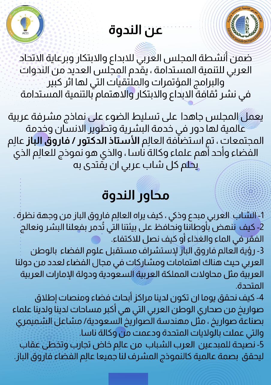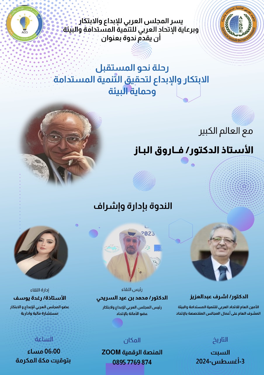 دعوة للقاء مع العالم المصري البرفيسور الدكتور فاروق الباز – جيولوجي وعالم فضاء ومدير مركز الاستشعار عن بعد بجامعة بوسطن بأمريكا والرئيس الفخري للاتحاد العربي للتنمية المستدامة والبيئة