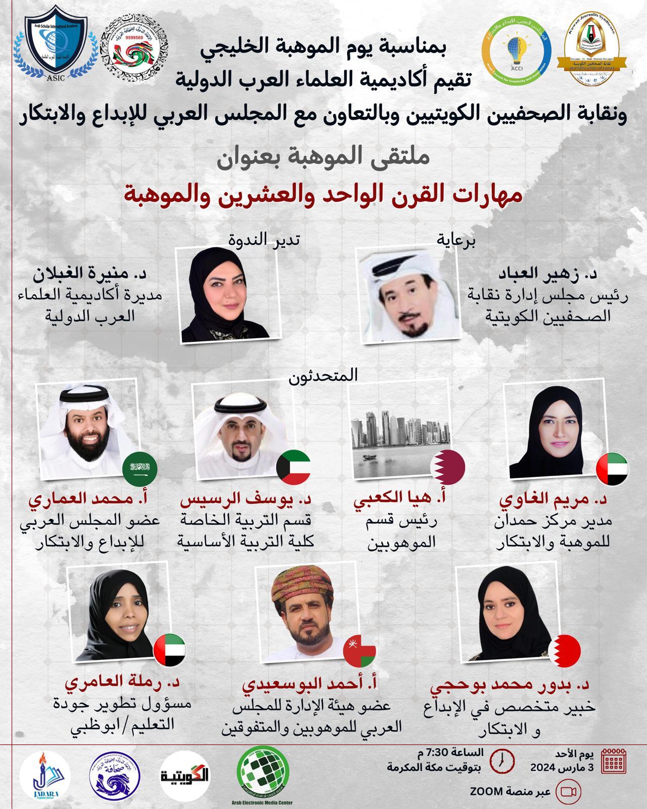 بمناسبة يوم الموهبة الخليجي تقيم أكاديمية العلماء العرب الدولية ونقابة الصحفيين الكويتين وبالتعاون مع المجلس العربي للإبداع والابتكار ملتقى الموهبة الخليجي بعنوان : مهارات